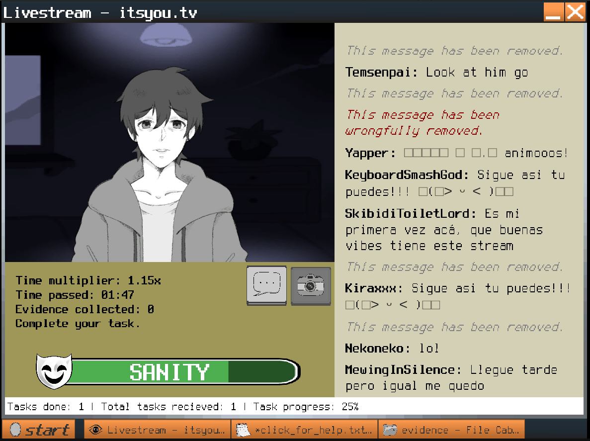 "It's You" es un juego de point & clic narrative, en el cual jugamos como el moderador de un streamer popular, llamado Iam Nox, quien tras haber sido acosado por un fan obsesionado con una falsa idea de su comportamiento, termina siendo secuestrado, y obligado a hacer streams sosteniendo esta careta de Streamer perfecto bajo amenaza de muerte.